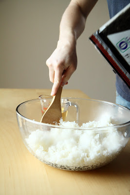 While cutting and folding the rice with one hand, use the other to fan the rice (if you don’t have a hand-fan, a paper plate or piece of cardboard will work… I just grabbed the package of nori to fan my rice with!). Fanning the rice helps it cool faster, and creates a glossier finish and more desirable texture.