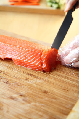 1. Sashimi Grade fish can almost always be purchased pre-cut into a long rectangle, which is easy to slice into strips for sashimi or sushi. If your fish is not cut this way, you may need to fabricate (prepare it) yourself. I won’t go into all the details of filleting fish, but for mine it was necessary that I remove the skin (by making a horizontal incision near the tail, tilting the blade down towards my cutting board, and working the blade back and forth up the length of the fillet to separate the meat from the skin). I then sliced off the thinner sides of the fillet (which I cut into lengths to use in sushi-rolls) and was left with a rectangular piece of meat. You may also need to run your fingers up and down the surface of your fish feeling for pin-bones — if you feel any bones, use fish tweezers to pluck them out.