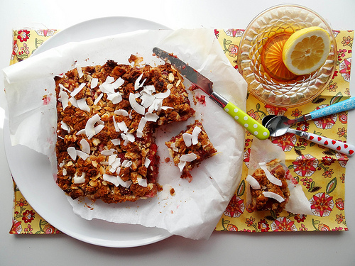 Joining me in the field of snacks and desserts, my friend Heather at Sunday Morning Banana Pancakes made these Strawberry Rhubarb Coconut Crumb Bars. Yes, let me say it again: Strawberry Rhubarb Coconut Crumb Bars. These treats combine some of my favorite flavors, and besides being a wonderful addition to the potluck would make a great dessert or on-the-go snack!