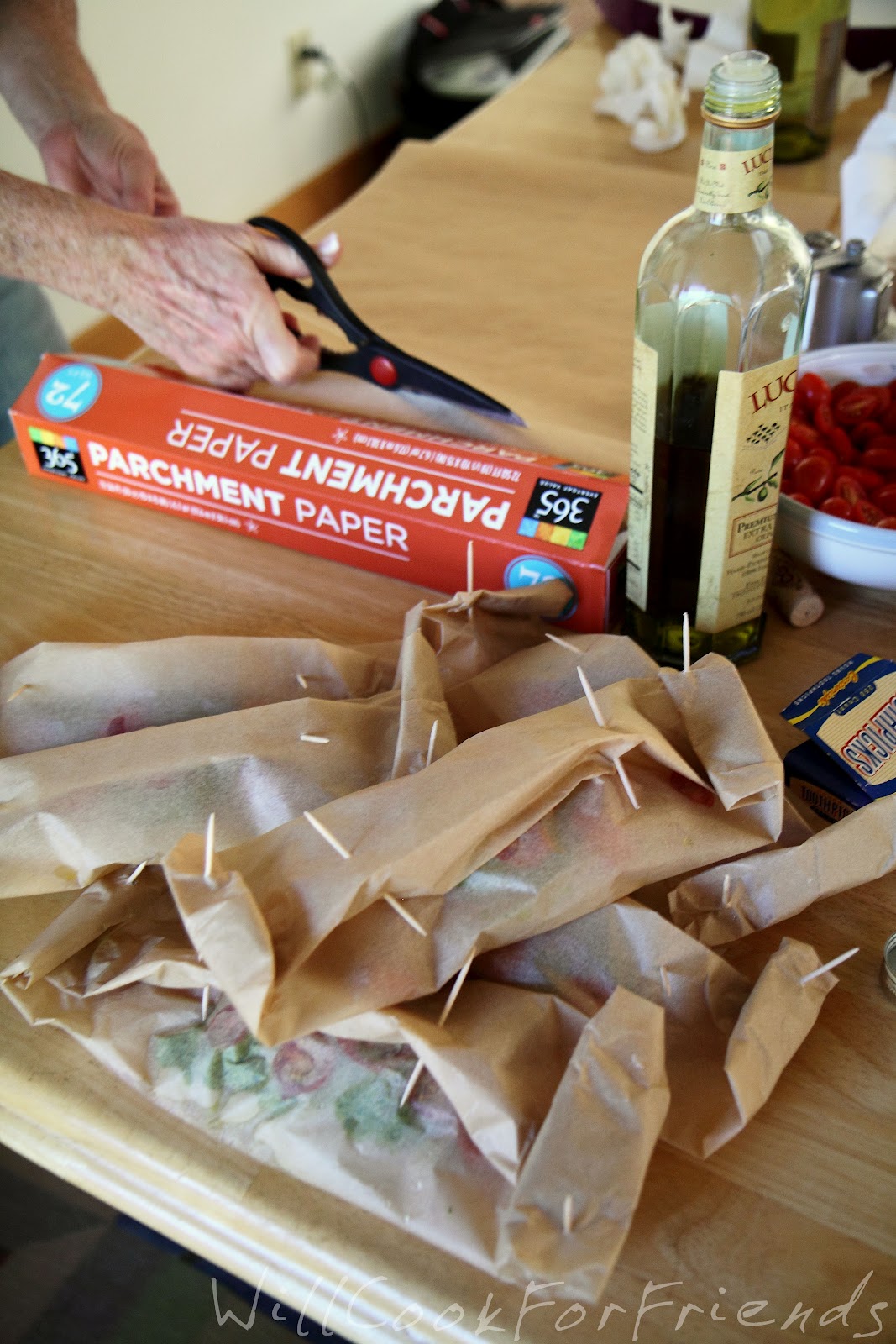 And also started prepping the food and drinks. For dinner I prepared this simple Fish En Papillote (click for recipe). With the help of my mom and Hilary we got all the fish wrapped up before everyone arrived, which made for a low-fuss evening. I also laid out platters of cheese, crackers, nuts, and fresh fruits for snacking, along with fresh loaves of bread from Zingerman’s.