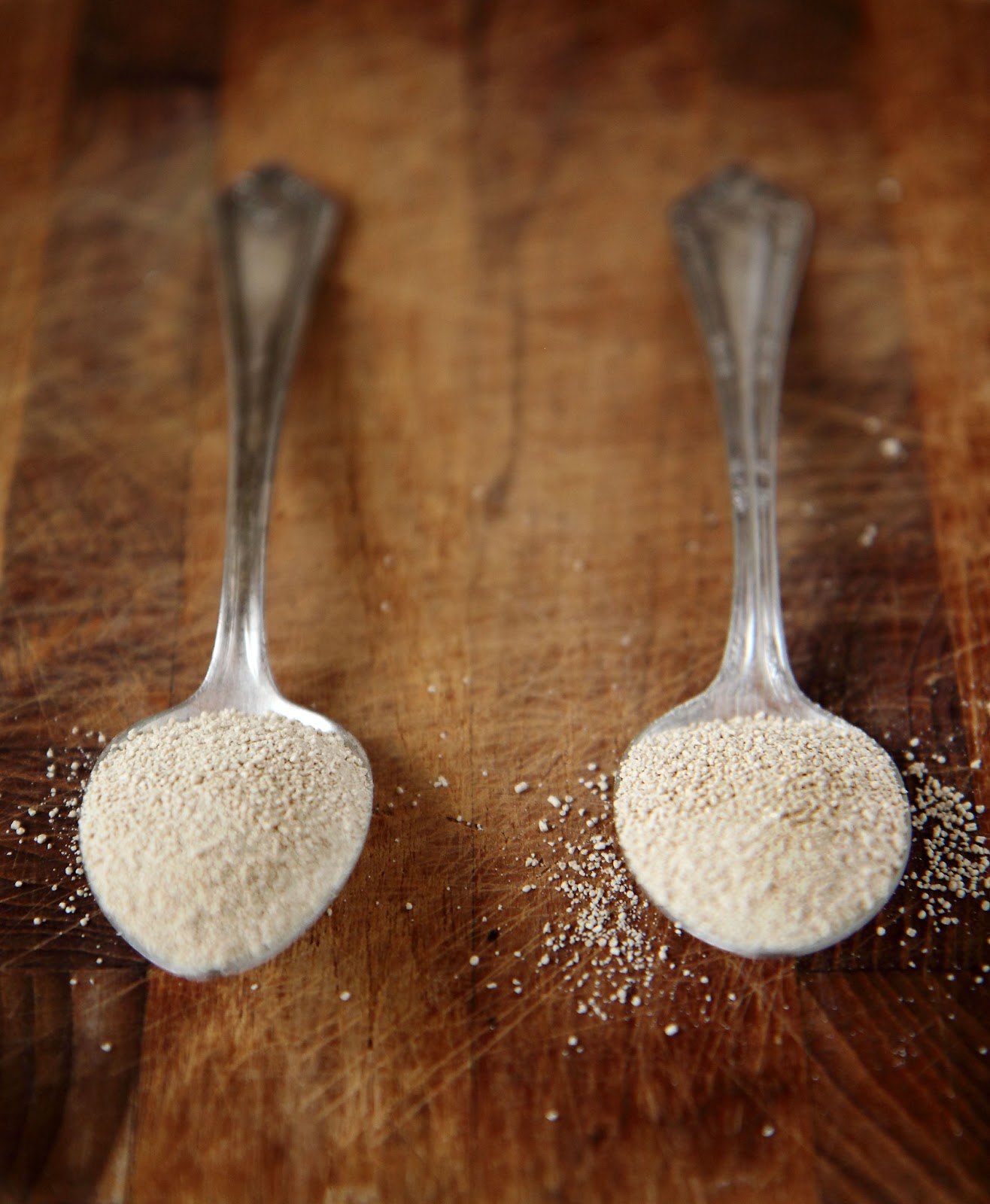 There are several different types of yeast out there. The common ones we find on the shelves of the grocery store are “Active Dry Yeast” and “Instant Dry Yeast” (also called quick-rise or rapid-rise yeast). I explain the differences of the two below. There are also “fresh yeast” and “wild yeast”. Fresh yeast is preferred by professional bakers, but is highly perishable and therefore less useful to home cooks. Wild yeast refers to the naturally occurring yeast organisms that live on the skins of fruits and berries (used to make wine), and in whole grain flours (used to make bread). By creating a healthy environment for the yeast (by mixing natural whole grain flour with warm water) the yeast begin to grow and multiply, feeding off the sugar and starches within the flour. This mixture can be kept alive by ‘feeding’ it with more flour from time to time, and is known as a