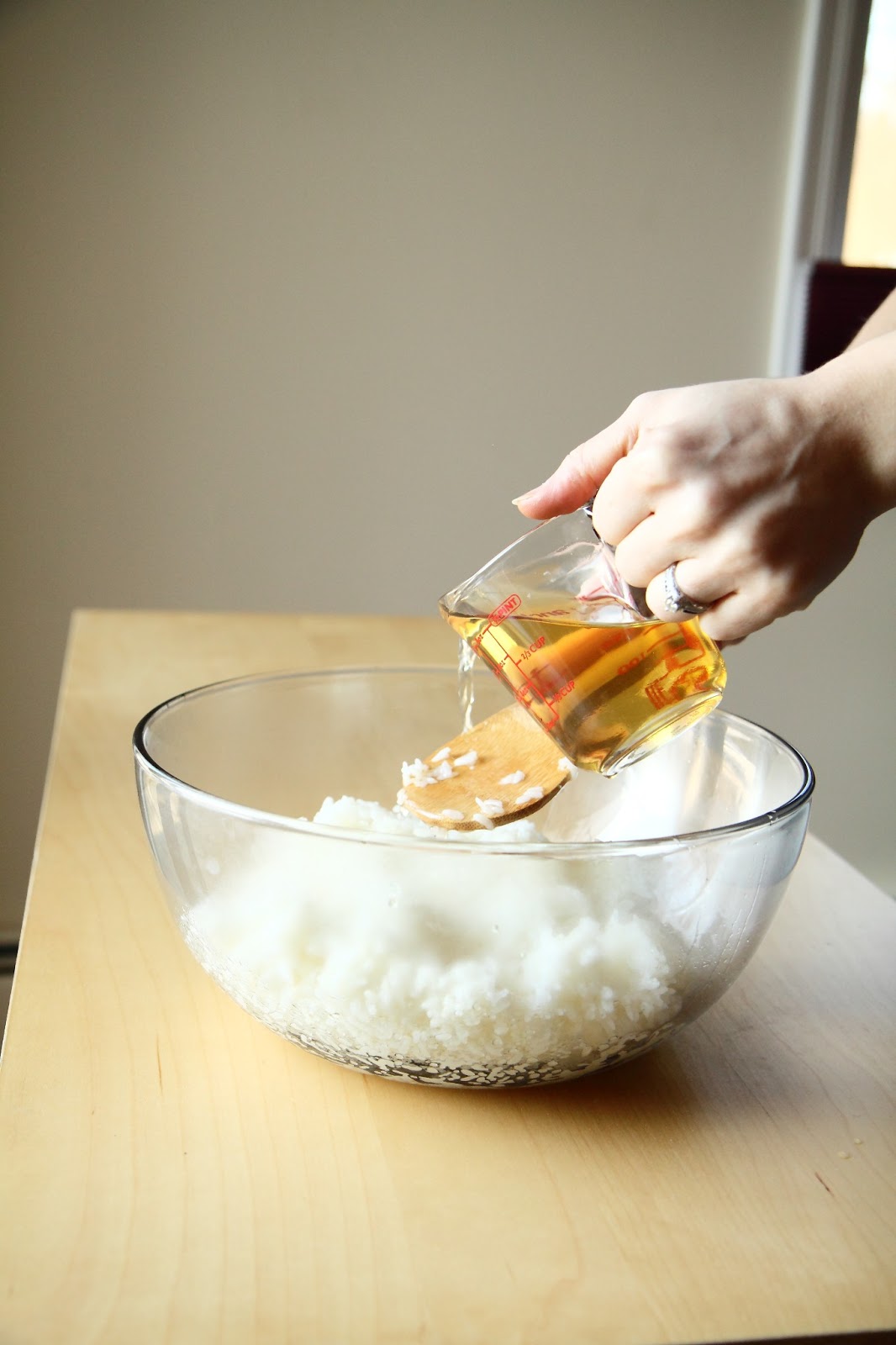 Pour about half of the sushi-su (vinegar mixture) evenly over the rice, and fold it in with your spoon or spatula. Make vertical slashes down into the rice with the edge of your spatula, then scoop the rice up the side of the bowl and over itself. Work gently so as not to mush the rice together — the goal is to separate the individual grains so that the rice is coated evenly, and isn’t too dense.