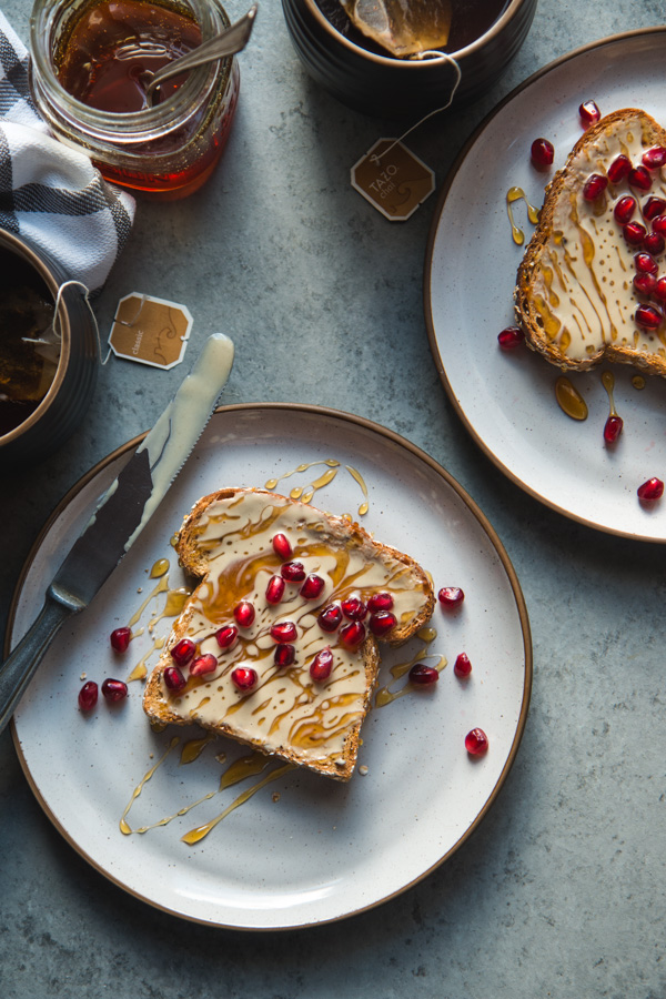 All you need for these tahini and honey toasts are tahini, honey, and (obviously) toast. But I like to take it a step further and add a smattering of pomegranate seeds on top.